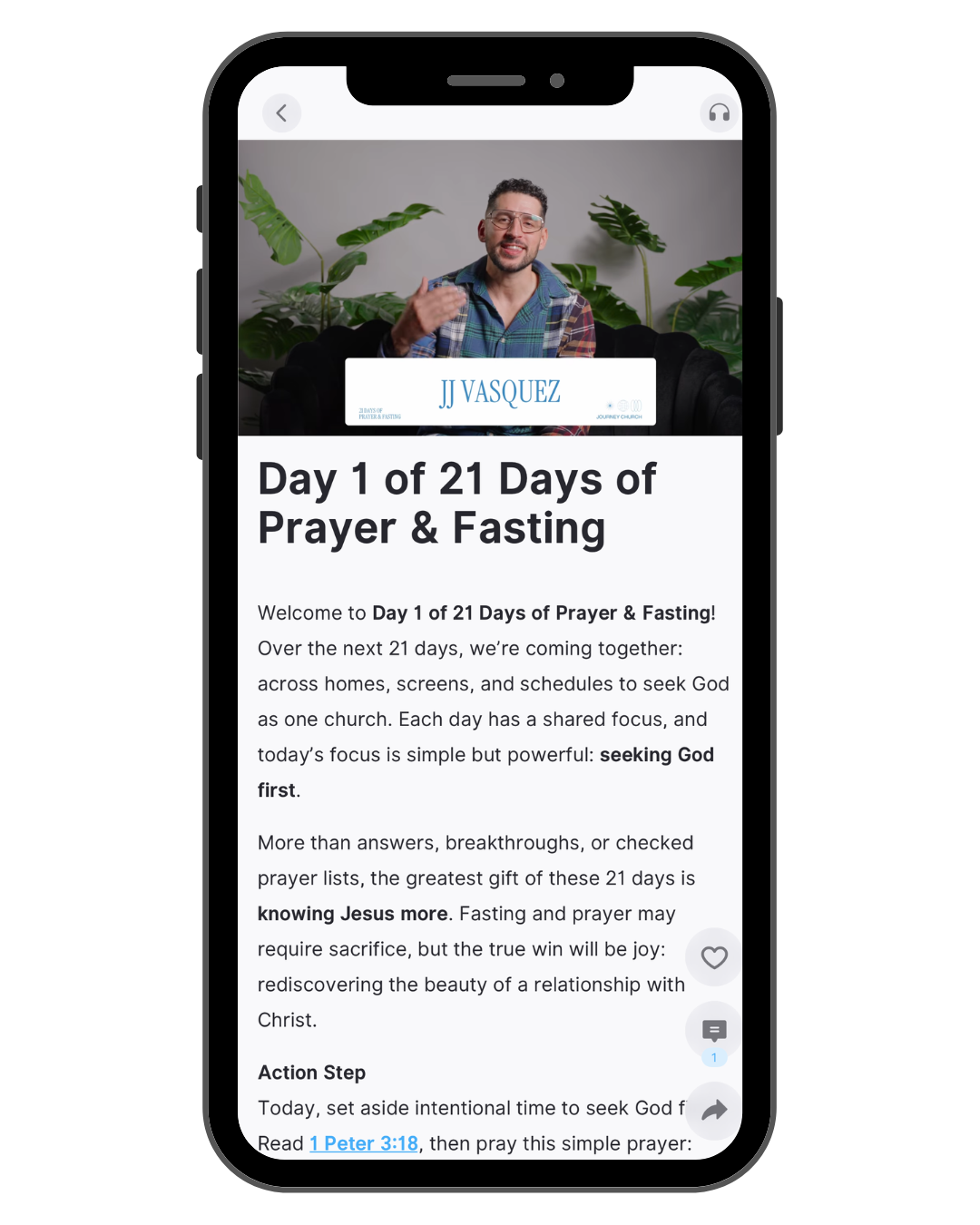 Make the most of your 21 Days of Prayer and Fasting with our app! Access daily video devotionals and guided prayer topics designed to dive deeper into the word and focused throughout the 21 days. These resources are available exclusively on the Journey Church app.